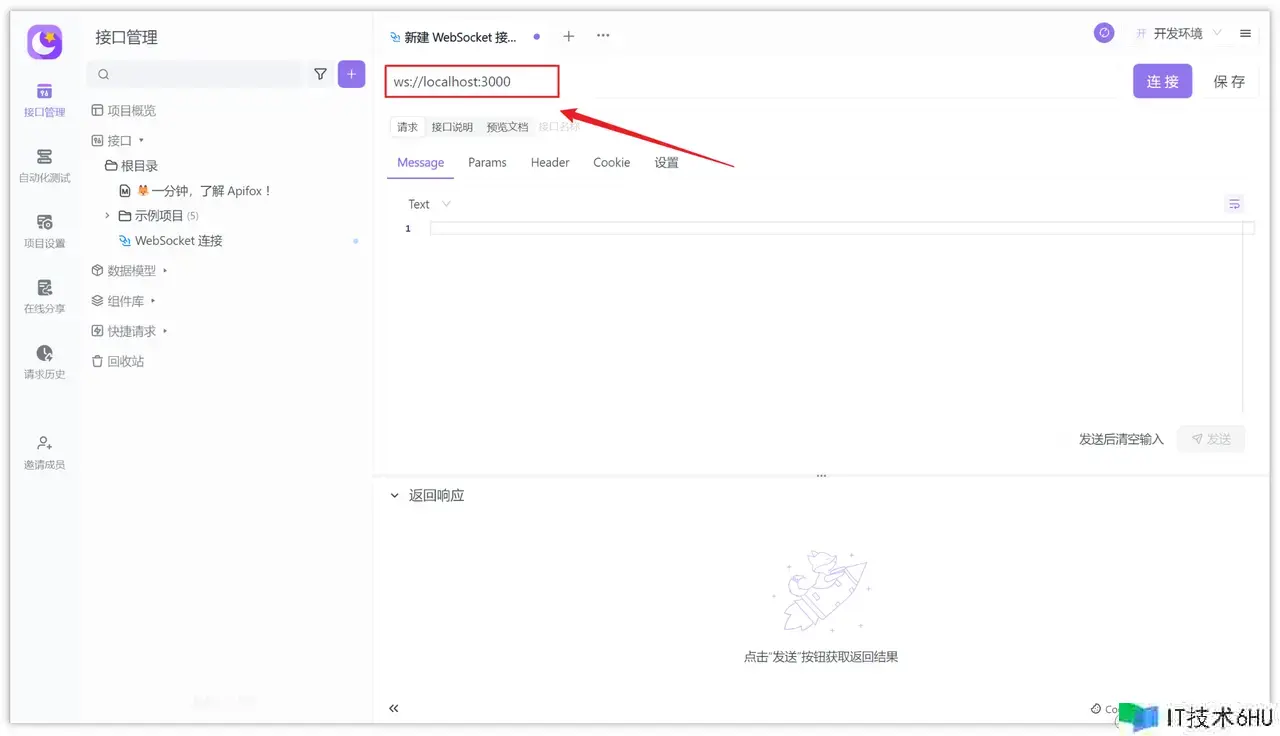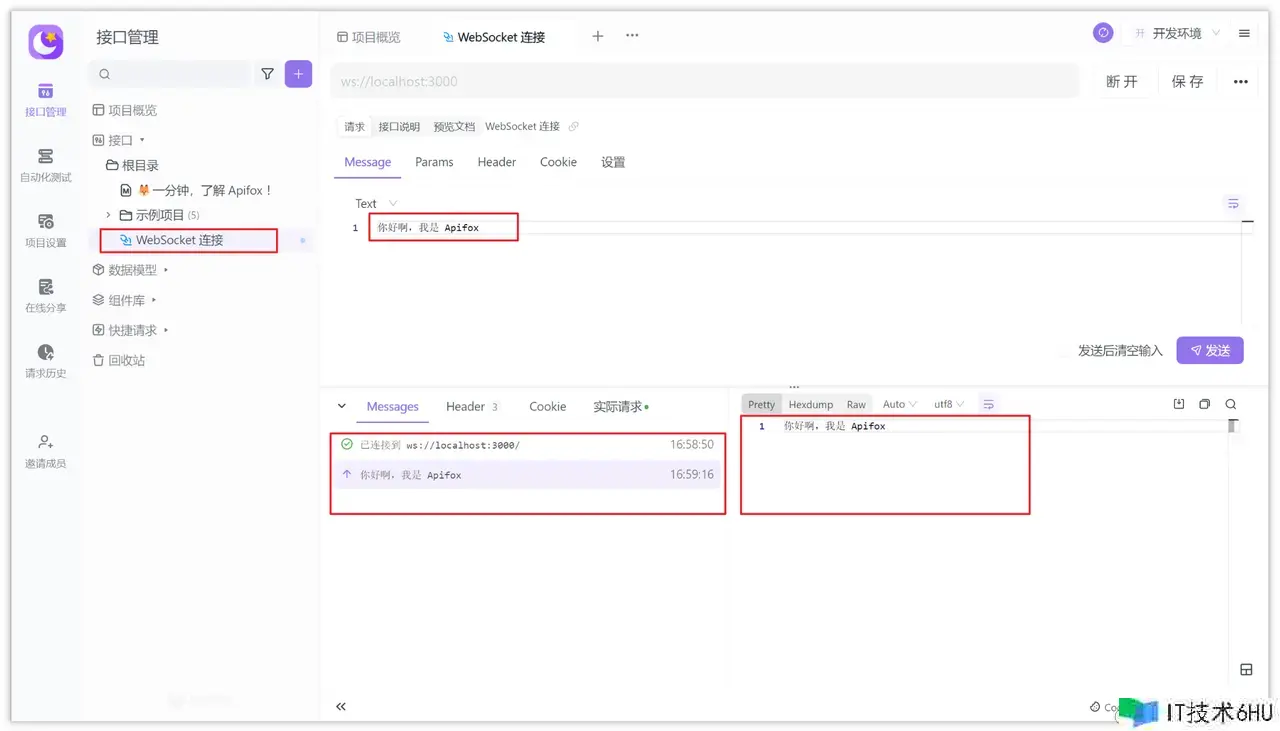 3、输入测验音讯,比方“你好啊,我是Apifox”,点击发送音讯,调查服务器和客户端的响应。