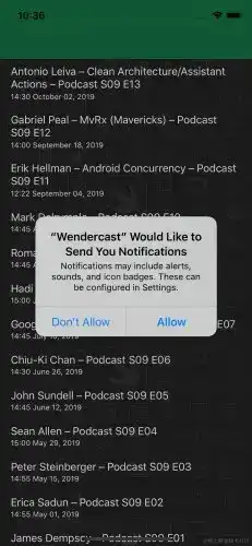 要开端,保证你的 iPhone 是选定的设备。然后构建并运转。你应该看到一个播客列表,并弹窗提示是否启用告知。点击答应。