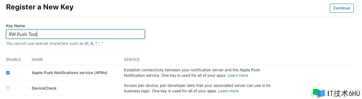 - 填写密钥称号, 勾选 Apple Push Notifications Service (APNs) 然后点击 Continue。