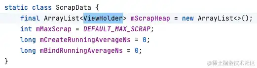 先获取 viewType,然后根据 viewType 获取 ScrapData,然后获取它的 scrapHeap 调集;也便是咱们的 ViewHolder 是寄存在 ScrapData 中了;