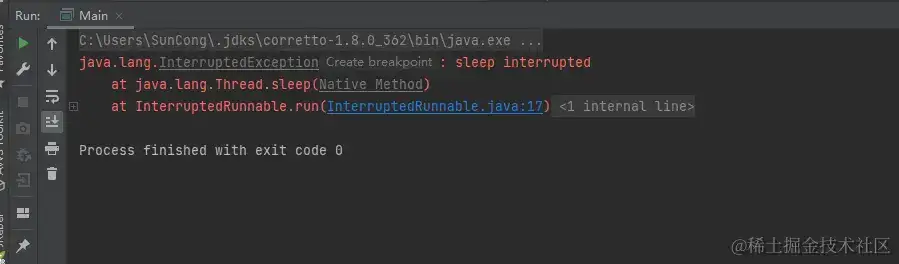 上述代码分明调用了线程的interrupt()办法来中止线程,可是却并没有起到啥作用。原因是线程的run()办法在履行的时分,大部分时间都是阻塞在sleep(100)上,当其他线程通过调用履行线程的interrupt()办法来中止履行线程时,大概率的会触发InterruptedException反常。