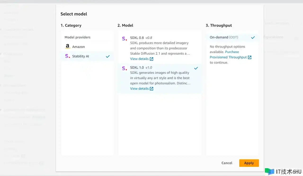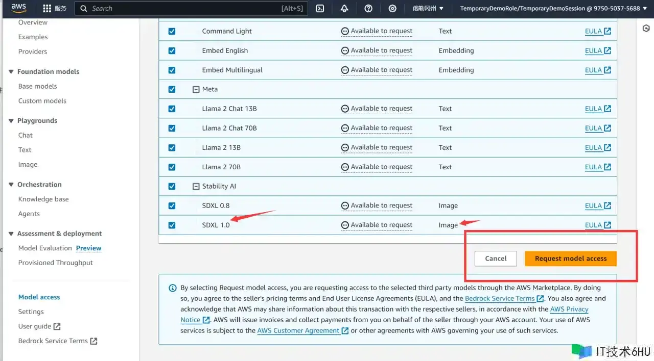 勾选需求的模型,假如要体会GPT-对话功用,必须要勾选任意一项Text标签的模型,假如需求体会Stable Diffusion-文本生成图画功用,必须要勾选带Image标签的模型,这儿引荐SDXL 1.0版别,当然也能够运用Titan Image Generator ,然后点击Request model access完结授权。