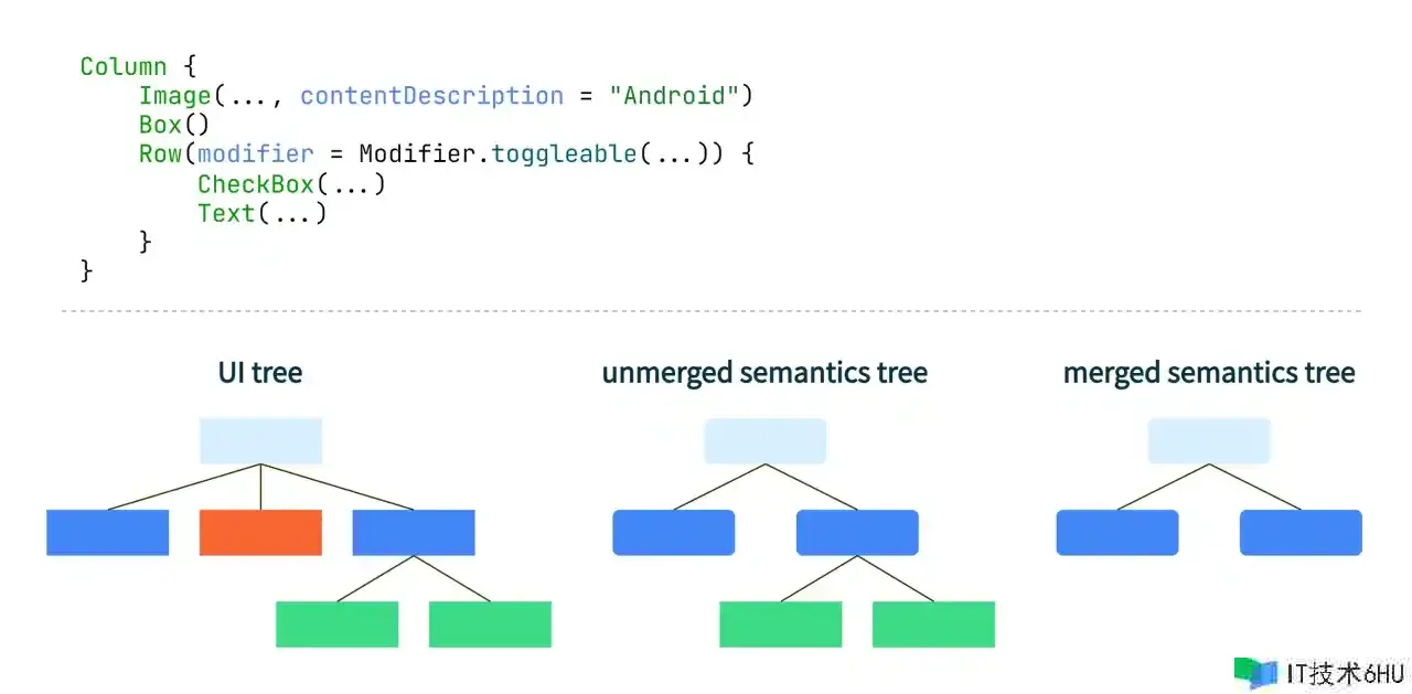 实践上除了这颗 UI 树,Compose 中还有别的一颗结构类似的树,叫做语义树,每个节点都是一个 SemanticsNode。语义树彻底不参与制作和渲染工作,因此是彻底不行见的,它只为 Accessibility 和 Testing 服务。