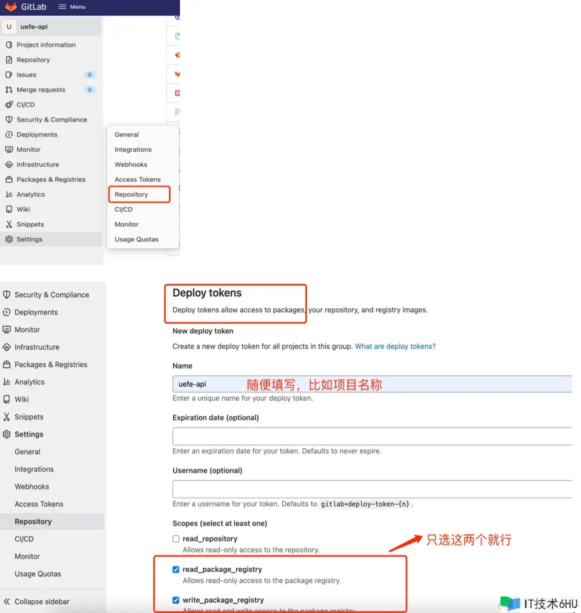 项目创立完结之后,需求生成项目私有的认证令牌,咱们把uefe-api这个库作为咱们要发布的npm包,先生成它的Deploy tokens记住:不是Access tokens,我在这个坑爬了两天才出来);