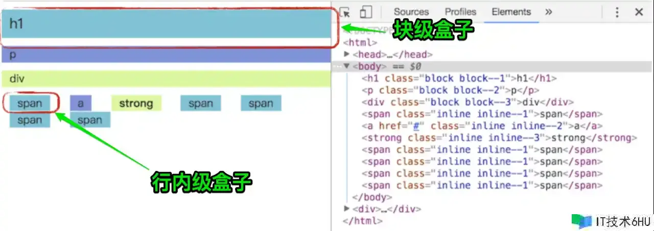 从图中能够看出来,有些元素的盒子被烘托为完整的一行,比方 h1、li 等元素;有些元素的盒子则被烘托为水平摆放的,直到该行被占满然后换行,比方 em、strong 等元素。
