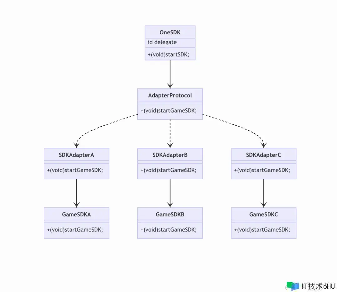 在事务分工中,OneSDK不直接参与游戏事务,在顶层API和底层事务SDK中充当桥接效果,当调用OneSDK API时,经过AdapterProtocol寻找能够呼应API的游戏事务Adapter。