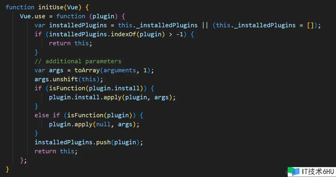 vue.use办法在注册插件机制时运用的,它承受两个参数,第一个参数是插件自身,第二个参数是要传递给插件的选项。插件自身能够是一个函数也能够是一个目标,当是一个函数时use办法会当即履行该办法: