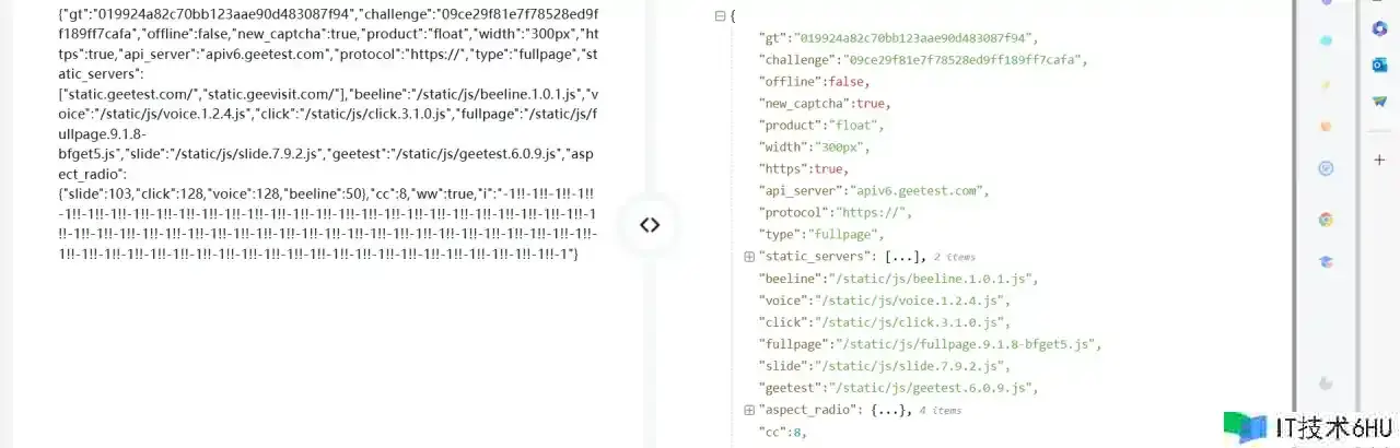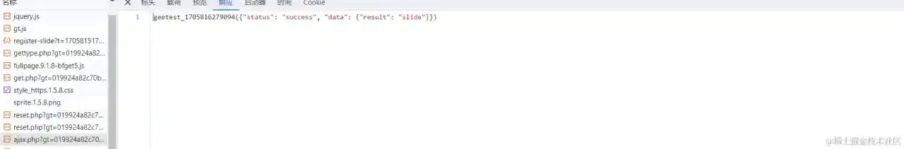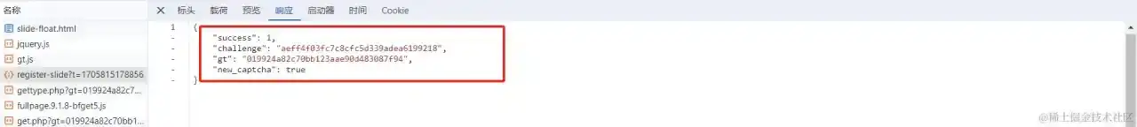 刷新页面,经过抓包发现, register-slide 接口会回来 challenge 和 gt 值,为接口 get.php 的首要恳求参数: