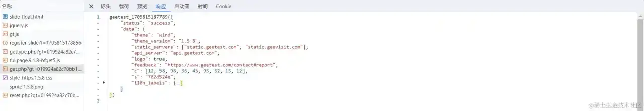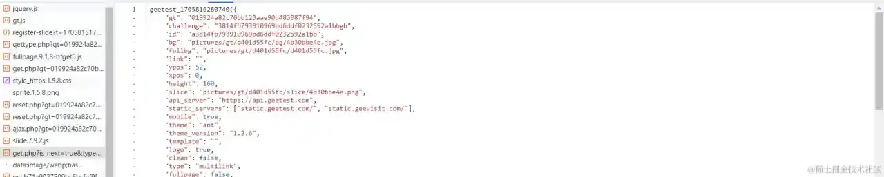 紧着着,咱们要又抓到一个 get.php 接口,这个接口仍然给咱们回来 c 和 s,恳求不一样的是,这个接口里边还给咱们回来滑块图片以及底图: