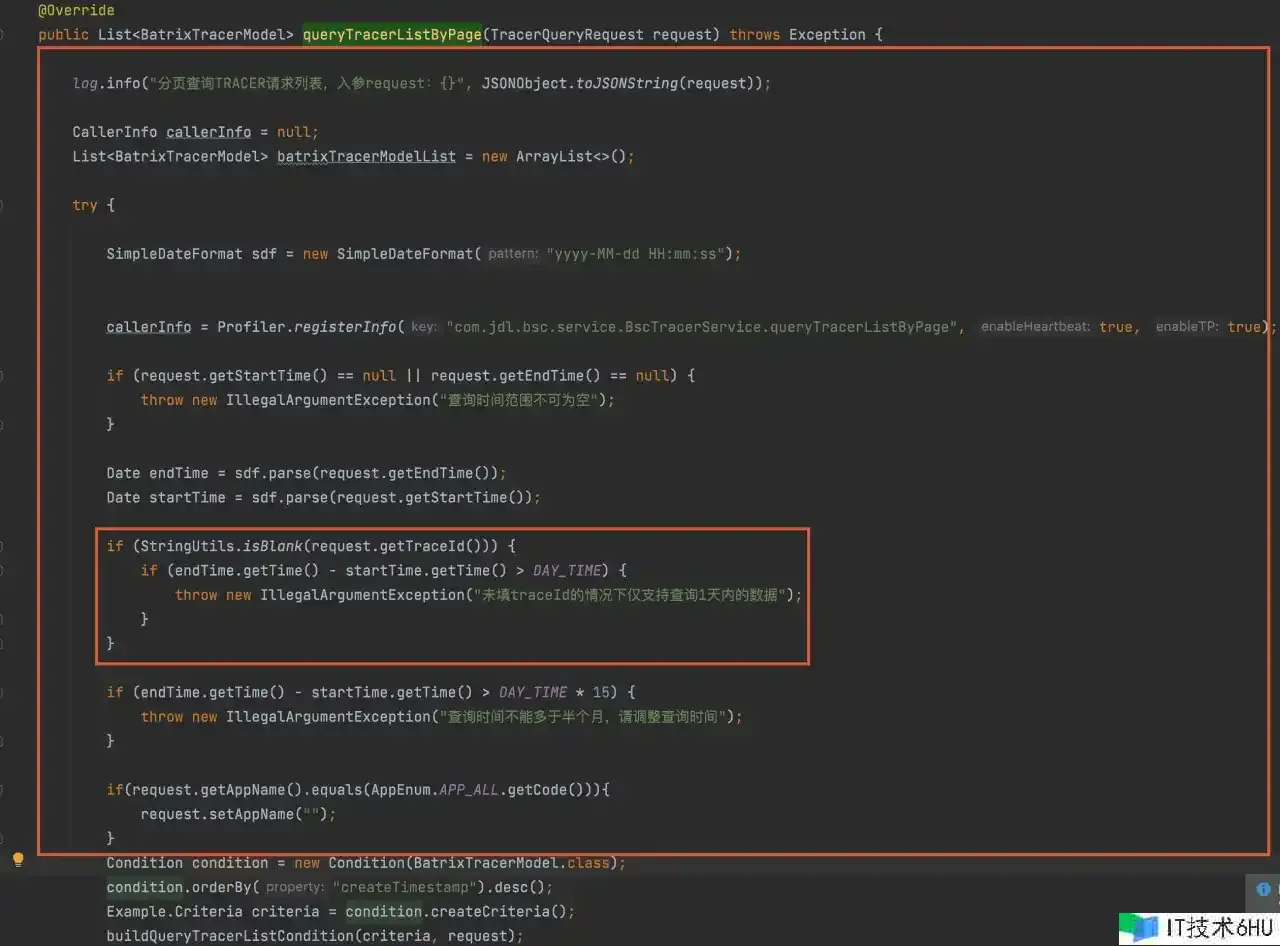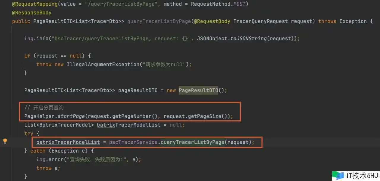 先看一下A办法的代码就会发现,在运用了PageHelper.startPage之后,Mybatis查询SQL之前,有很多判别逻辑,而且问题就产生在中间标红的反常状况判别。