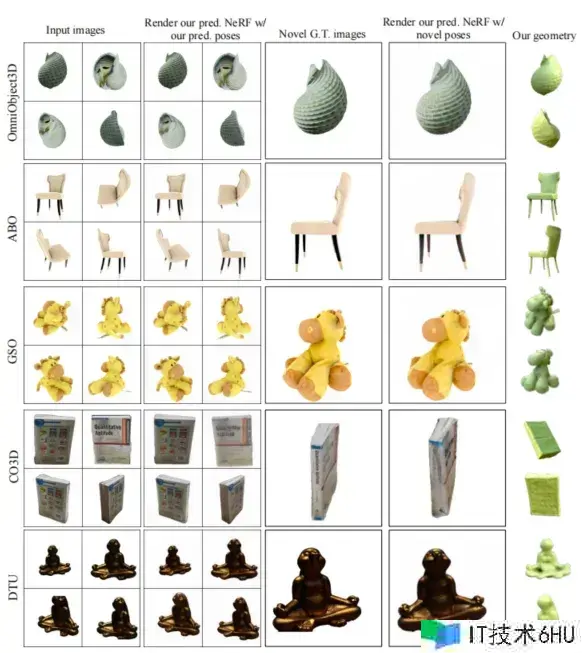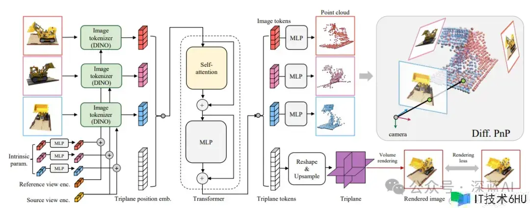 在这项作业中,研究人员提出了一个根据tansformer的三维重建大模型来估量摄像机参数,并以三平面NeRF来重建三维物体。该模型选用自注意力机制,以三平面token和图画patch token相互沟通关键信息,然后进步终究NeRF重建质量,并运用可微PnP求解器进行鲁棒的每个patch表面点猜测。现在该模型在姿态猜测精度和重建质量方面大大优于基线办法,也能够在下游使用程序中运用,比如文本/图画到3D生成。