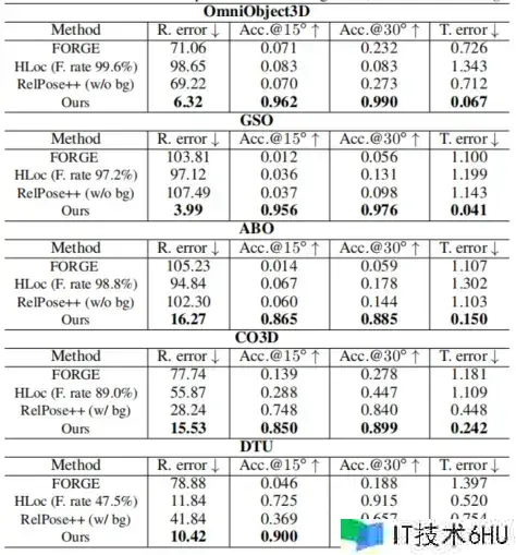 本模型在OmniObjects3D、ABO、GSO、CO3D和DTU等不知道数据集上取得了超卓的成果。比较基线办法(FORGE、HLoc、RelPose++),本文的模型在各项度量指标下都取得了明显的优势。作者特别重视了不同办法在跨数据集泛化才能方面的体现,这反映了它们在实践使用中的功能。对于OmniObjects3D、GSO和ABO数据集,作者相对FORGE取得了均匀14.6倍的旋转差错减少率,相对HLoc和RelPose++分别为15.3倍和14.7倍。