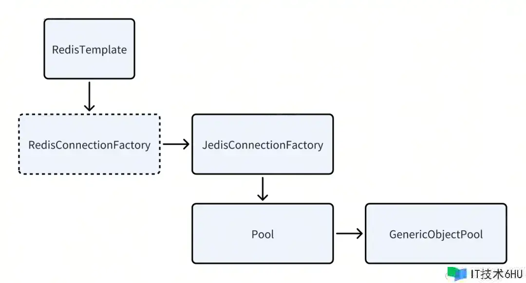 捋一下其间的关系,咱们常用的 Spring-Data-Redis 的 Jedis 完成最终是经过以下的层级结构来运用 GenericObjectPool 的。