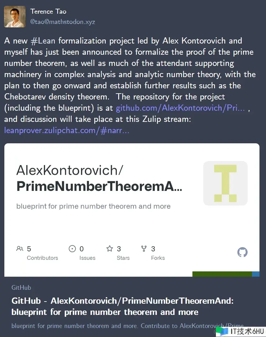 「由 Alex Kontorovich 和我领导的一个新的 Lean 形式化项目刚刚正式宣布,该项目旨在形式化素数定理(prime number theorem,PNT)的证明,以及随同而来的复分析和解析数论的支撑机制,并方案给出进一步的结果如 Chebotarev 密度定理。」著名数学家陶哲轩在个人博客中写道。