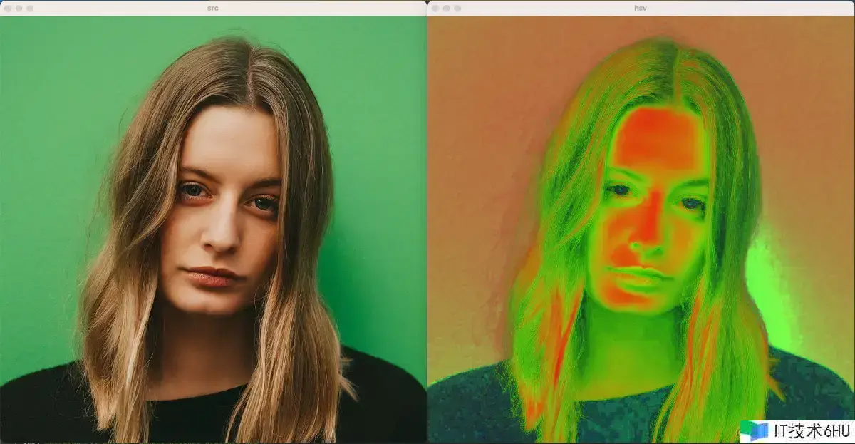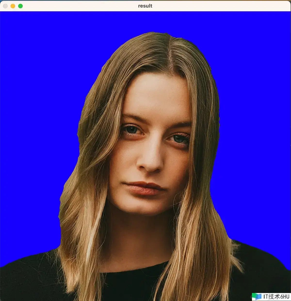 下面的比如,先将图片转化到 HSV 颜色空间,再经过 cv::inRange() 函数将女孩从绿色布景分离出来,最后用蓝色布景替换原先的绿色布景。