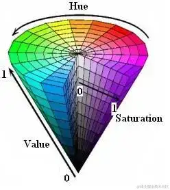 HSV 是一种将 RGB 颜色空间中的点在倒圆锥体中的表明办法。360度的圆作为色相,饱和度的值便是色相切点指向圆心的线,此刻的颜色还是不行用于表明。再引入一个亮度,圆锥的垂线,越往上图片越亮,反之越暗。