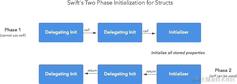正如你所看到的,榜首阶段从调用托付初始化器 init(temperatureCelsius:pressureAtmospheric:) 开端,在此期间不能运用 self。阶段1在 self.pressureKiloPascals 在非托付初始化器中被赋值后完毕。每个初始化器在每个阶段都扮演着一个角色。