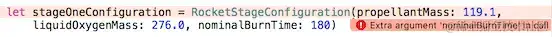 留意stageOneConfiguration怎么持续用两个参数成功初始化。现在把nominalBurnTime参数从头增加到stageOneConfiguration的初始化中: