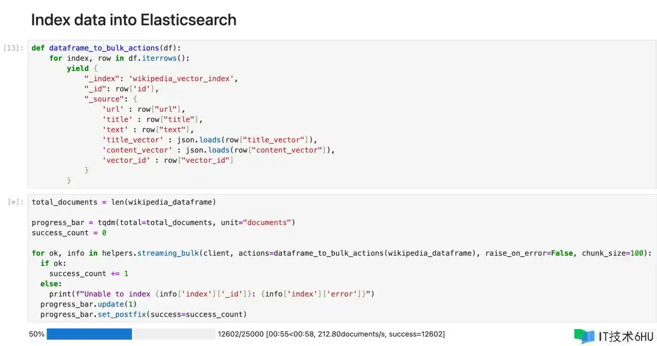 6. for ok, info in helpers.streaming_bulk(client, actions=dataframe_to_bulk_actions(wikipedia_dataframe), raise_on_error=False, chunk_size=100):