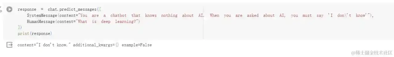 咱们尝试用SystemMessage来指定一下模型的行为,指定模型对AI一窍不通,在答复AI相关问题时,答复“I don’t know”。