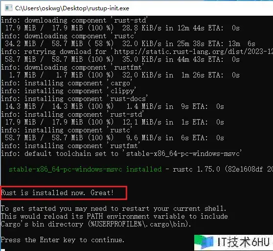 当看到上面这个提示就说明现已装置完成了,最终测验rust是否装置成功