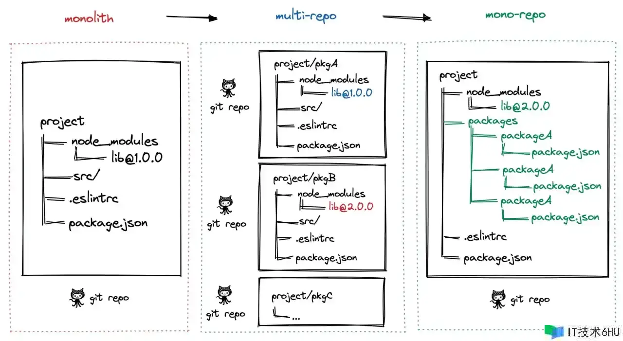 从单库房巨石运用(Monolith),到多库房多模块运用(MultiRepo),最后转向单库房多模块运用(MonoRepo)。每个阶段都有其优势和应战,挑选哪种方法取决于项目的具体需求和团队的作业流程。