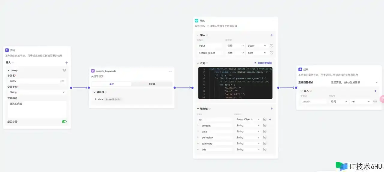 代码节点的功用是将 start节点的 query 参数与search_keywords节点回来的参数data作为输入的参数数据,并对 data 的数据做过滤,并将过滤后的数据回来。