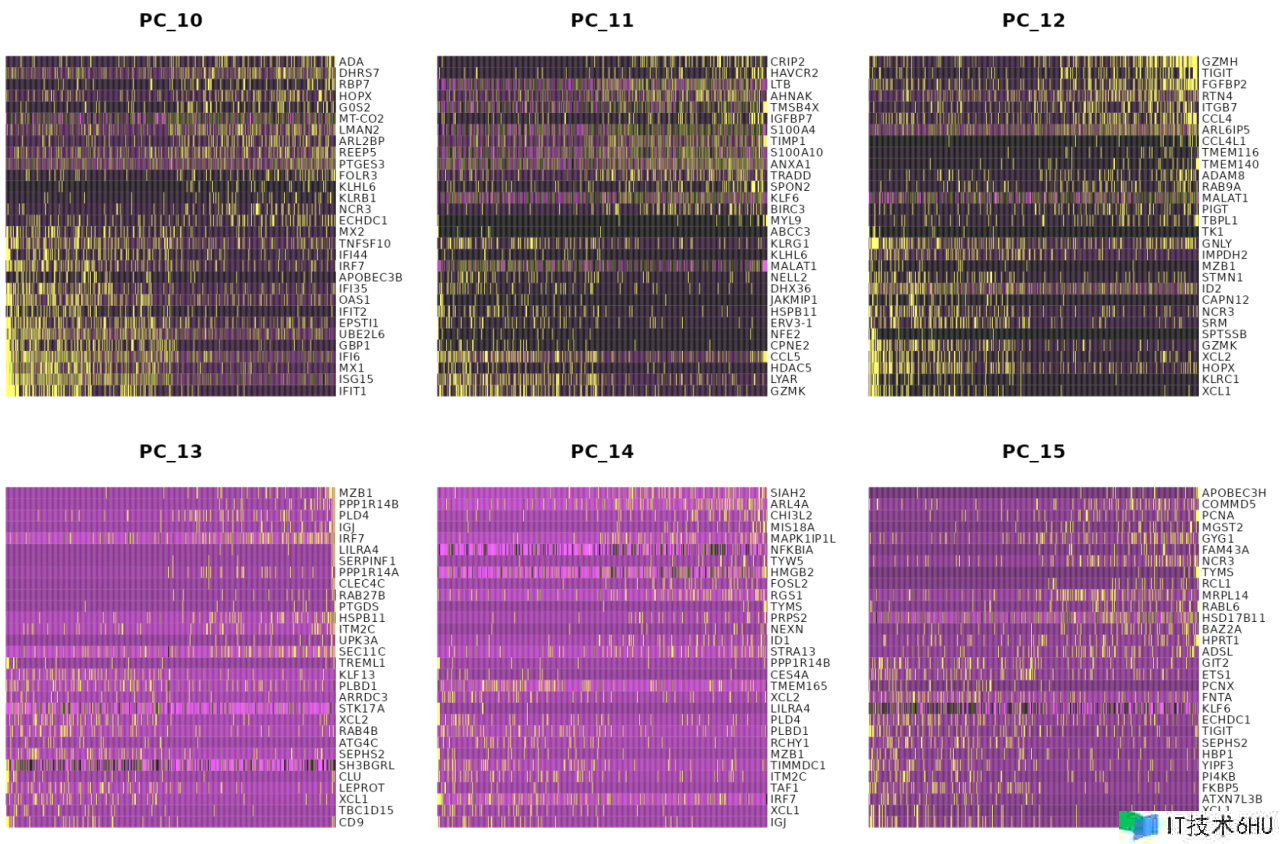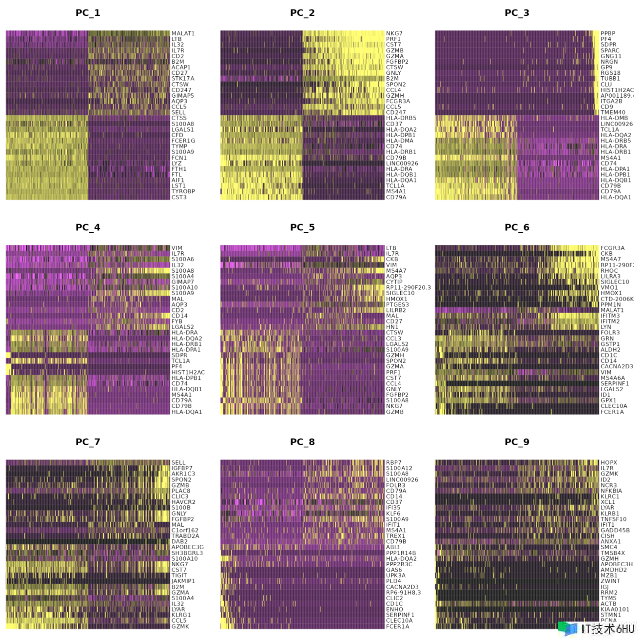特别是 DimHeatmap() 答应轻松探究数据会集异质性的主要来历,并且在测验决议包含哪些 PC 进行进一步的下流剖析时非常有用。细胞和特征均根据其 PCA 分数进行排序。将细胞设置为数字会在频谱两端绘制“极点”细胞,这会明显加快大型数据集的绘图速度。尽管是一种监督剖析,但咱们发现这是探究相关特征集的宝贵工具。