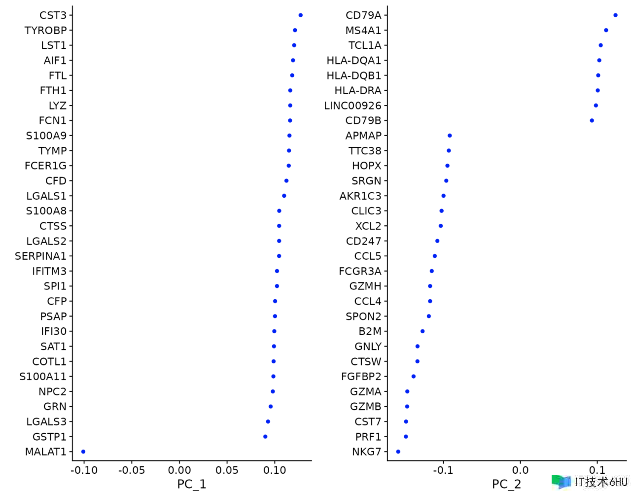 关于第一个主成分,Seurat 输出具有最大正负载荷的基因列表,代表在数据会集的单细胞之间表现出相关(或反相关)的基因模块。