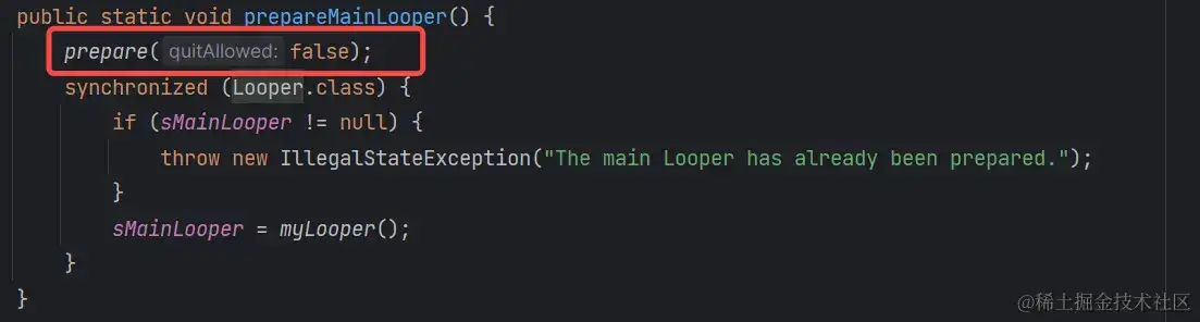 依据这个咱们能够猜测出 Looper.prepare() 可能与 Looper 目标的创立有关,查看 Looper.prepare() 代码: