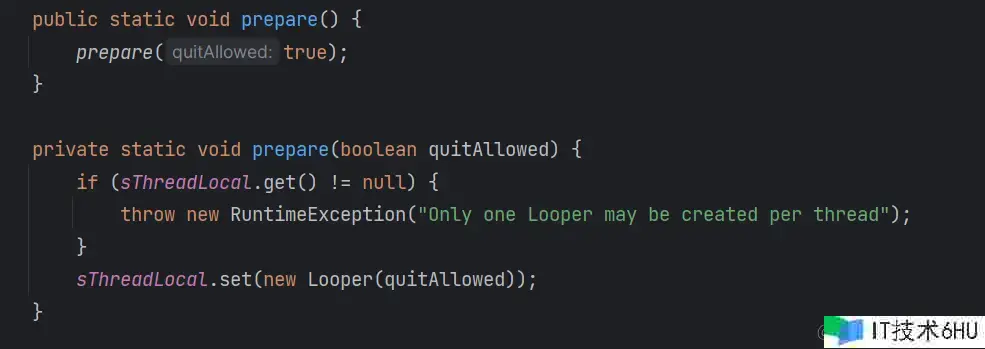 果然,在 prepare() 办法中创立了 Looper 目标,并将其设置到 sThreadLocal 中。