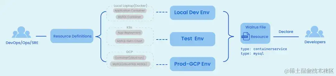 Walrus 经过 Resource Definitions(资源界说)构建多云、混合基础设施上层一致抽象,帮助运维团队根据不同基础设施及企业的最佳实践及安全合规要求挑选合适的基础设施组件并预置装备参数,一起屏蔽基础设施复杂度,让研制团队无需关注底层技术细节,以自服务方法在各类环境中创立并运用资源
