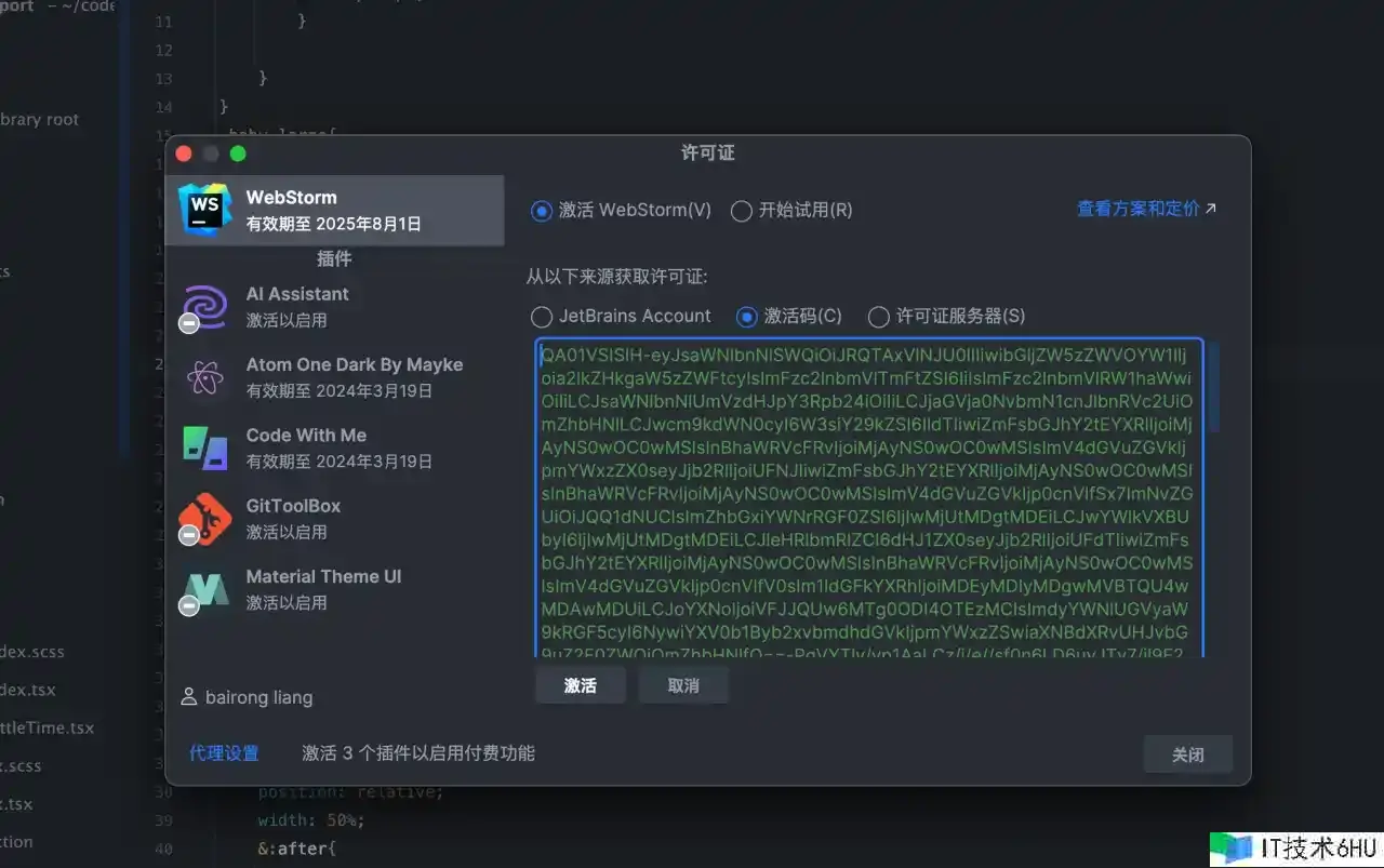 4、接下来就是软件的激活步骤,这儿以 webStorm 为例。找到激活工具包中 Activation Codes 文件夹,翻开 WebStorm.txt ,复制其间代码。粘贴到 webStrom,点击激活。