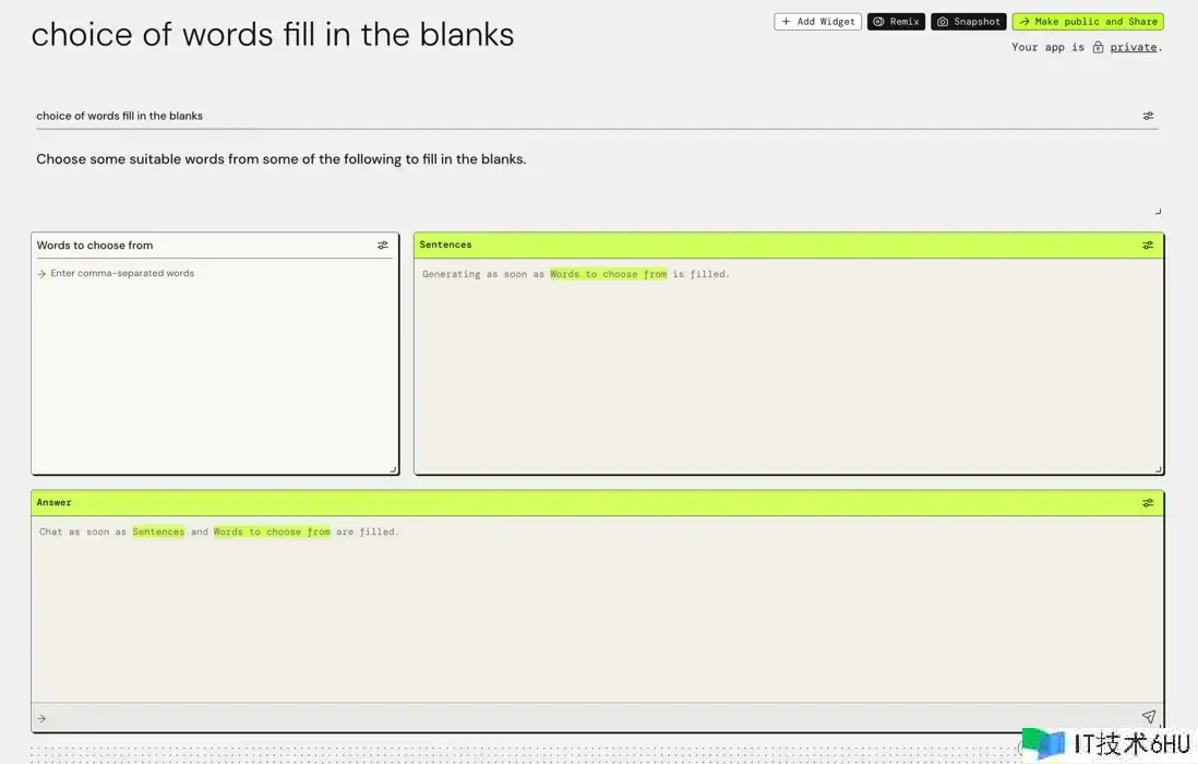 榜首步添加 widget ,其实咱们在上面看到的一个输入框便是一个 widget ,目前PartyRock供给了下面几种能够运用的 widget 。