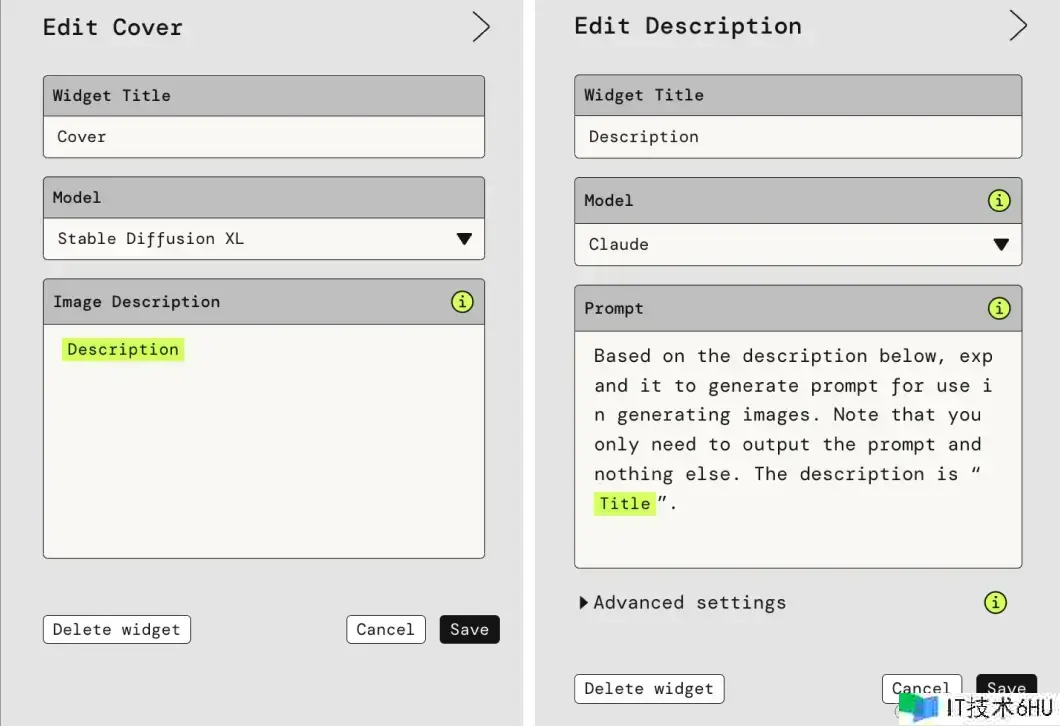 然后,咱们就需要编写 AI 生成的提示词了,点击每个 widget 右上角的修改,就能够输入对应的提示词,还能够挑选不同的模型。其间最重要的是,你能够运用 @ 符合直接引用其他 widget 生成的内容,比方,我需要根据用户输入的内容进行扩写,那么我在提示词里边就能够直接引用用户输入的部分;比方,我想根据扩写的内容生成图片,我就能够运用 “ @Description ” 引用扩写的内容。如下图 Prompt 中高亮的部分。