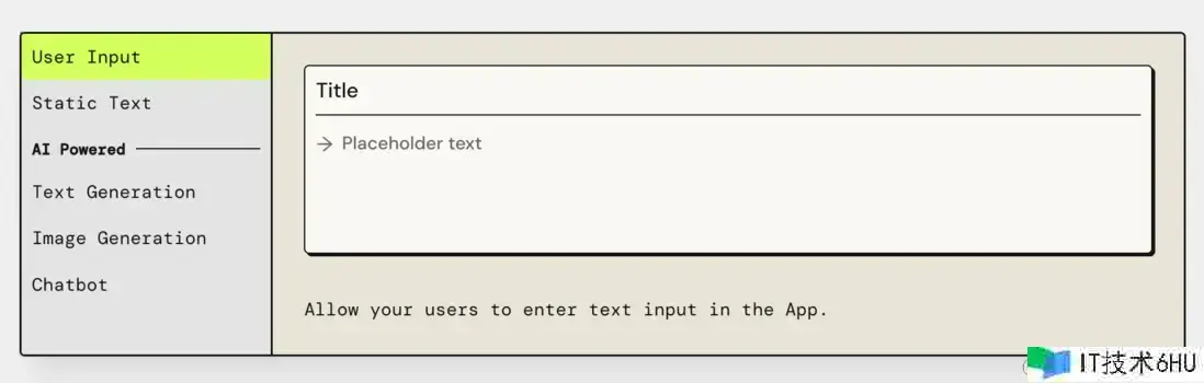 榜首个运用咱们是依靠的 AI 直接帮咱们生成的,尽管很简略,但是关于咱们开发者来说,与其去想描绘,不如直接着手来的快。所以这次咱们从零开始(挑选 “ Start from an empty app ” 选项),自己搭建一个运用试试看。这次我想试试有关于图片生成的才能,关于 AI 生成图片来说最麻烦的是写描绘词,所以我想让 AI 先帮我扩写,然后再运用扩写的内容去生成图片。