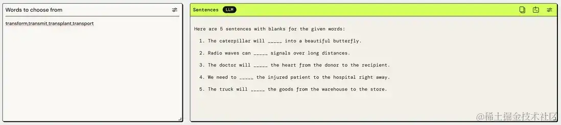 然后就能够测验一下了,在榜首个框 ( Words to choose from ) 输入一些单词,在右边 ( Sentences ) 就会生成对应的题目。