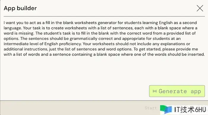 点击创立运用之后,在它给出的输入框里边输入你想要做的运用的功用描绘,比方说,我最近在学英语,我榜首想法便是做个选词填空的运用出来,所以我就在 App builder 的输入框里边输入如下的内容,然后点击 Generate app 就开始生成了。