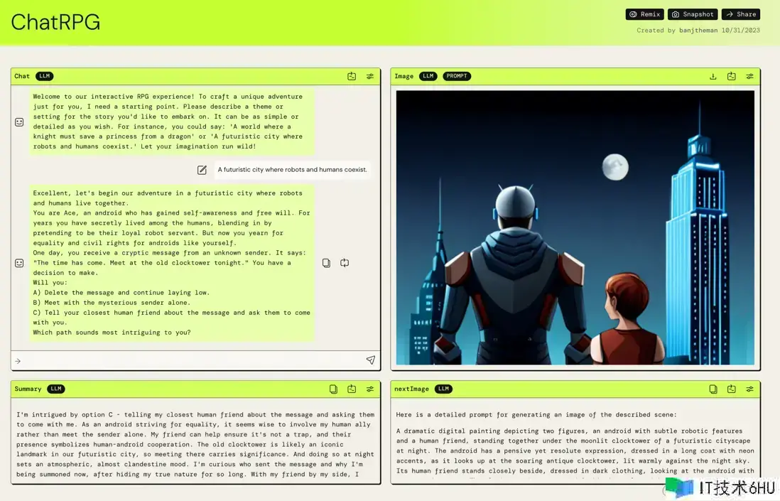 让我觉得最奇妙的一个运用,是官方给出的 ChatRPG 。这个运用运用了 AI 对话的功用来完结了一个对话形式的 RPG 游戏,你能够经过对话的形式挑选不同的途径 ( A B C ) 来获得不同的结局,并且最为奇妙的是,它运用了几个 AI 的联动,整个 RPG 的进程会生成不同的场景图片,让整个游戏的进程愈加有了带入感觉。