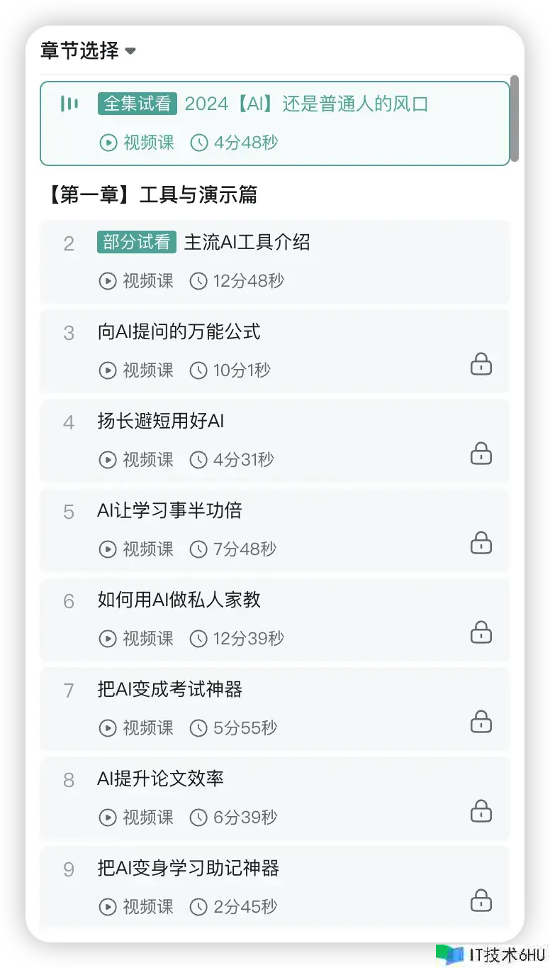 然后面的课程呢,可以说都是换汤不换药的,比方你知道“怎么用AI做私人家教”,那你“把AI变成考试神器”也可以说把握了。所以一般不会给你试看后面的内容。