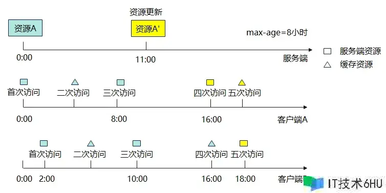 | 三次拜访 | 间隔前次从服务端下载资源超过了max-age时刻,从服务端下载资源,资源新鲜度时刻从头从8:00开端核算。 | 同客户端A,区别是资源新鲜度时刻从头从10:00开端核算。 |