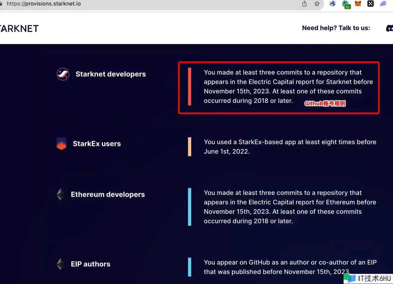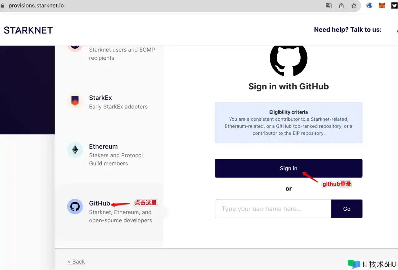 - 翻开provisions.starknet.io/ 页面,点击经过 GitHub 登录,查看你的Github账号是否满足空投资历。