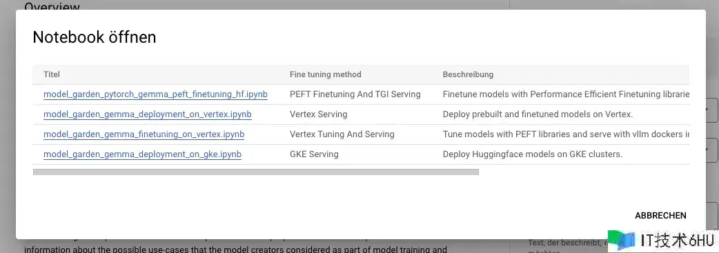 要在 Hugging Face 上微调 Gemma 模型,请拜访 模型页面 并点击 练习 -> Google Cloud。这将引导你进入 Google Cloud Console,在那里你能够在 Vertex AI 或 GKE 上拜访笔记本,以在这些平台上微调 Gemma。