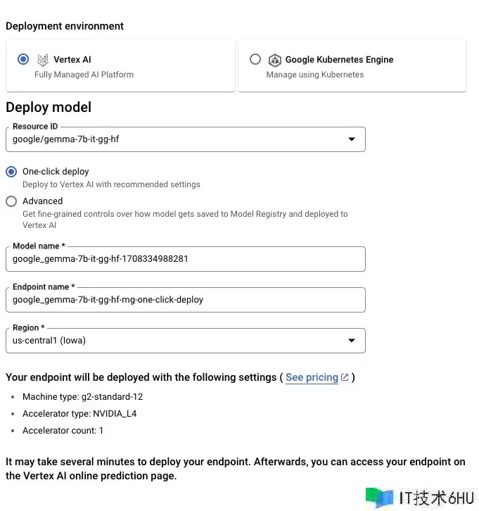 要从 Hugging Face 布置 Gemma 模型,请拜访模型页面并点击布置 -> Google Cloud。这将引导你进入 Google Cloud Console,在那里你能够经过 Vertex AI 或 GKE 一键布置 Gemma。文本生成推理为 Gemma 在 Google Cloud 上的布置供给支撑,这是咱们与 Google Cloud 协作伙伴关系的开始效果。