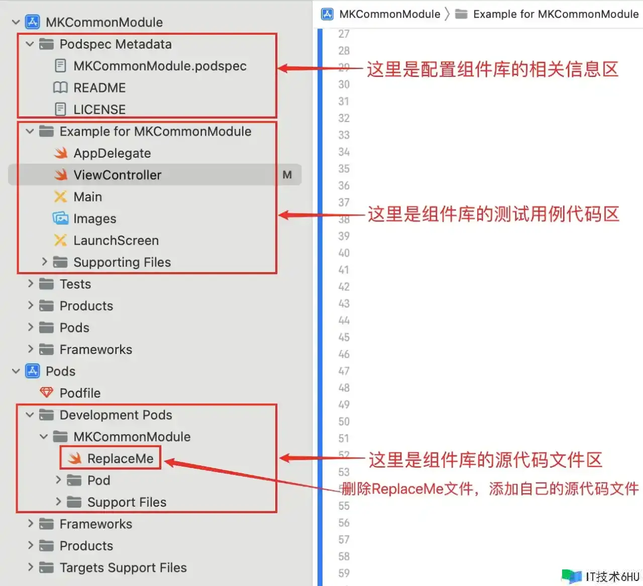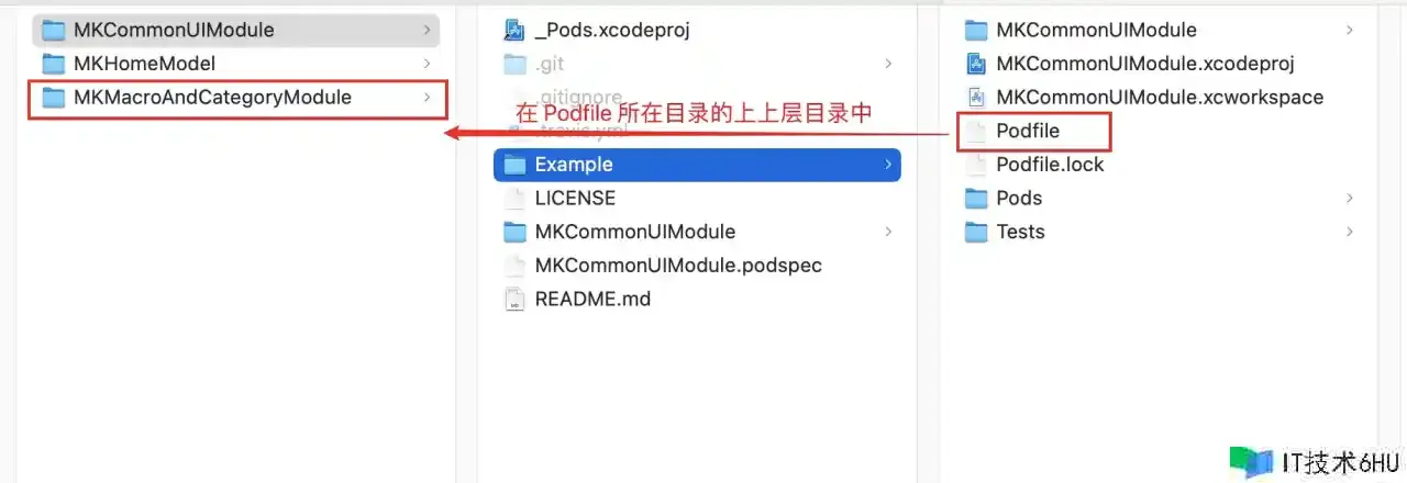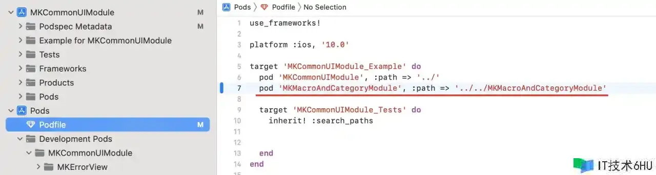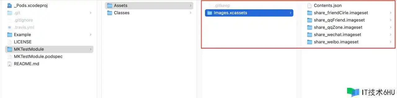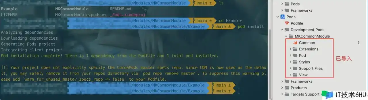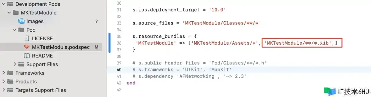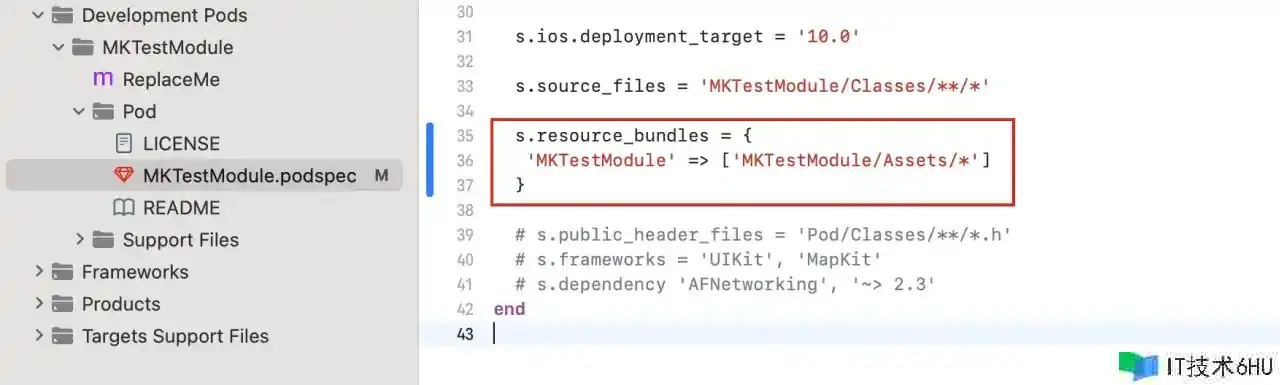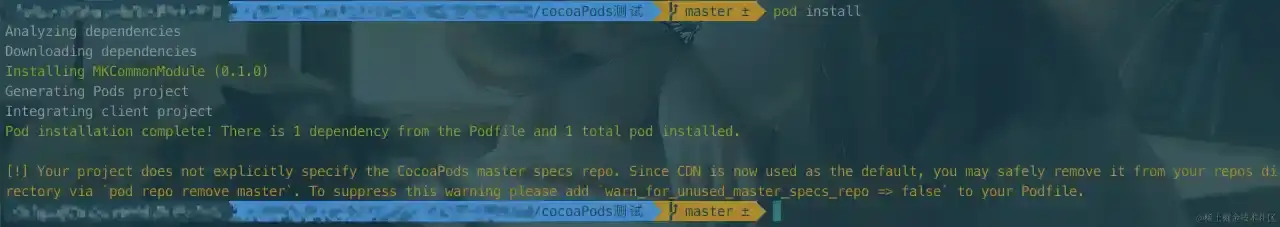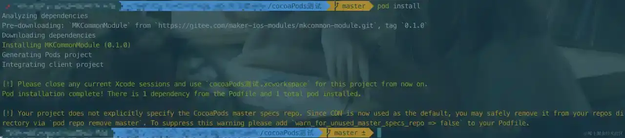 Assets 文件夹在第六大点<组件库加载资源文件>会有详细阐明。将写好的源代码文件放到该目录下之后,在终端 cd 到 Example 目录下运转 pod install,就能够在测验用例工程中运用了。如图所示: