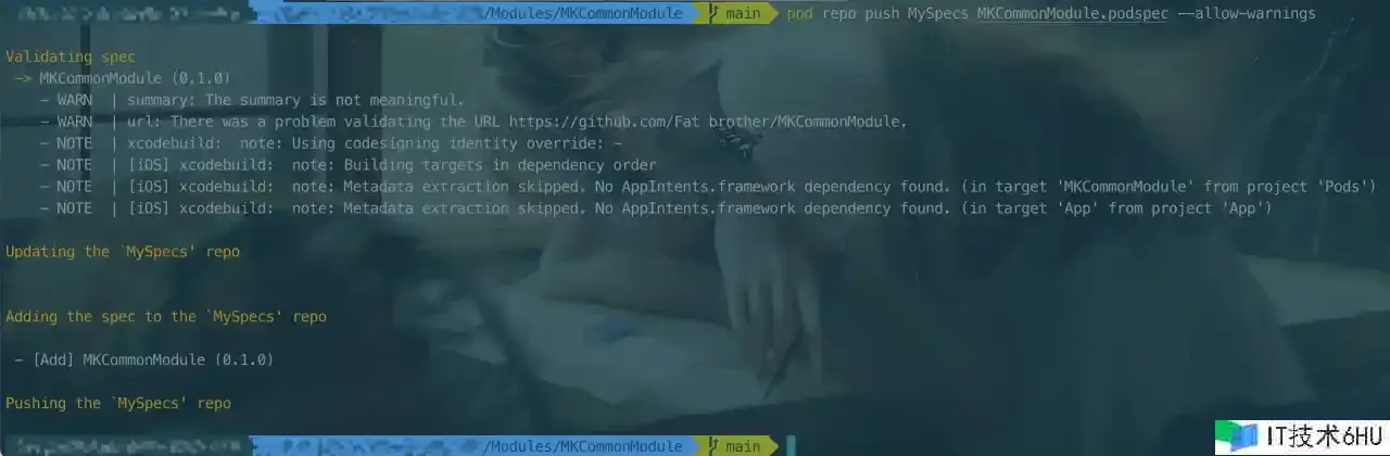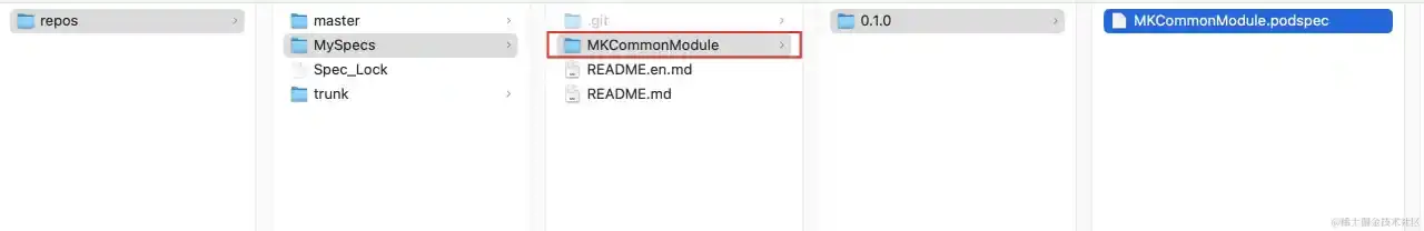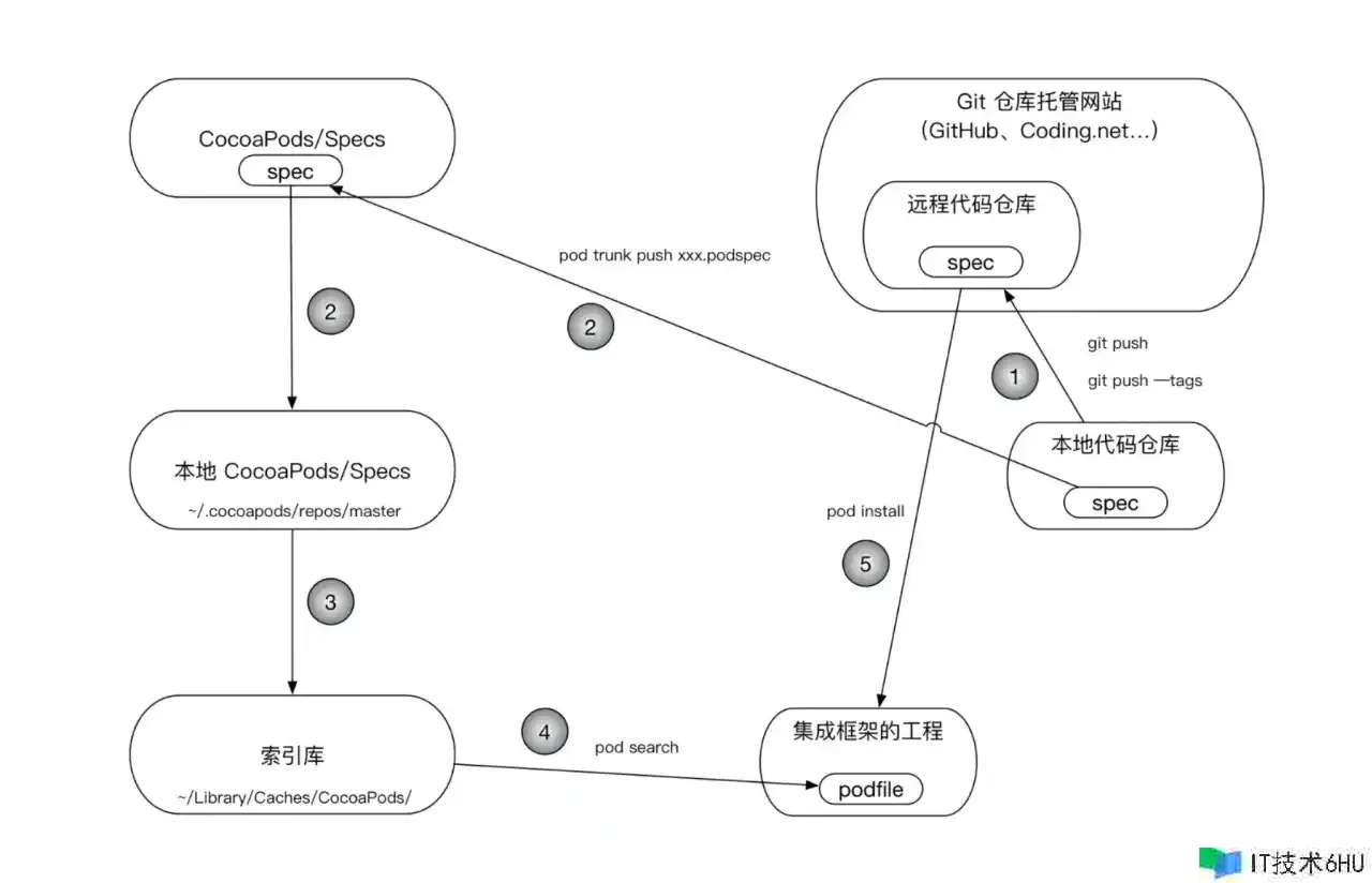 - 将本地代码库房的 .podspec 文件的信息推送到长途公共库房 Specs(这是一个索引库)。