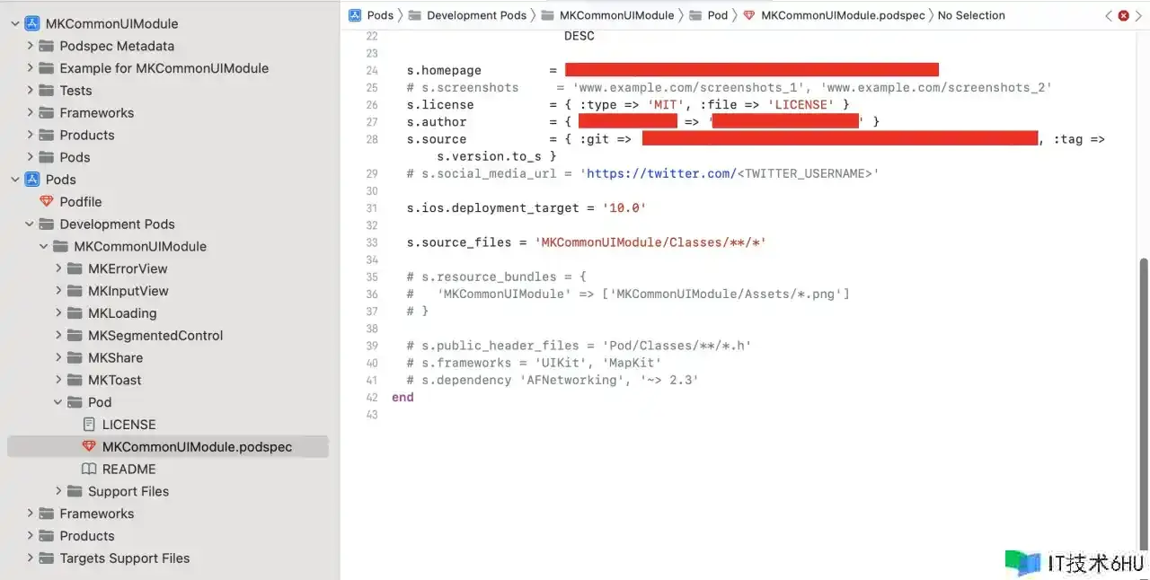经过 pod lib create 创立本地组件库会帮生成许多的文件,其间,README.md 是介绍这个组件的用处和运用,LICENSE 文件是一个协议文件,还有一个 .podspec 文件,接下来首要介绍 .podspec 文件。