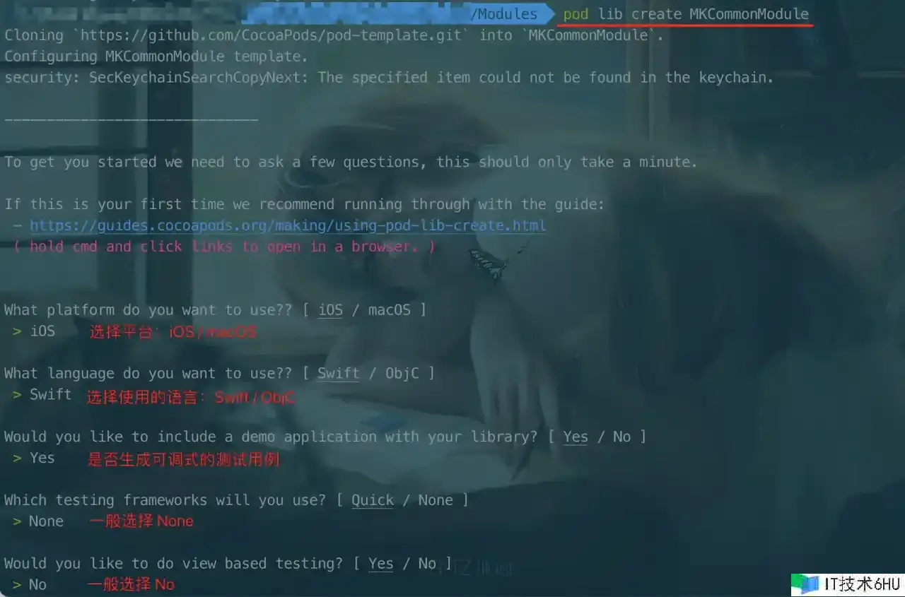 翻开终端,在指定目录下履行:pod lib create <Module称号> 即可在本地创立组件库。创立的过程中会提示挑选平台和言语等,如图所示: