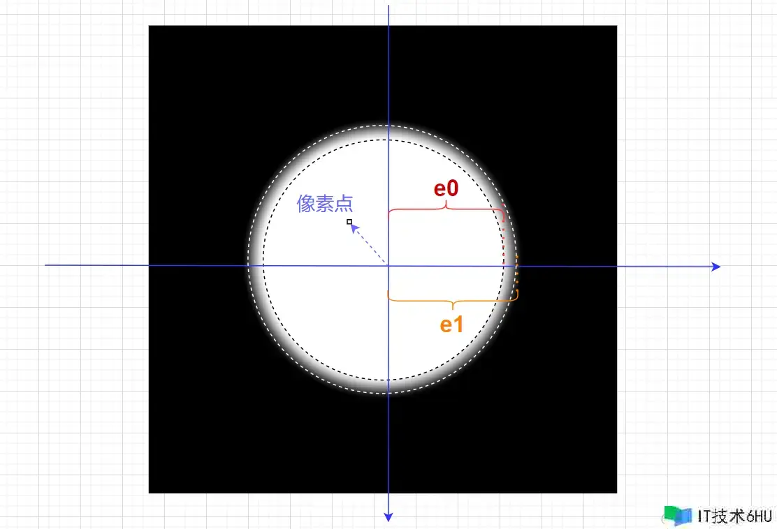 smoothstep 办法能够让结果在 [e0,e1] 区间内逐步改动,而不是像 step 非 0 即 1 的忽然改动。下面的 circle 函数中,len 表明像素坐标间隔,区间是 [r, r + 0.1] :