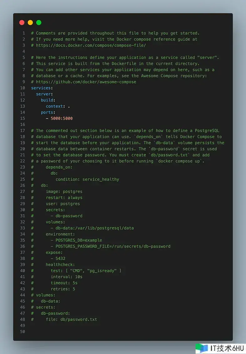 它编写了 docker-compose 装备来运转应用程序。由于咱们的应用程序不包括与数据库的任何连接,因此它注释掉了数据库容器可能需求的代码。